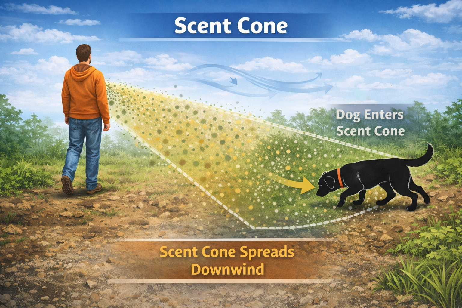 When a person stands in one place, scent particles begin to fall away from the body and settle onto the ground. As wind or air movement interacts with those particles, they begin to spread out downwind from the source.