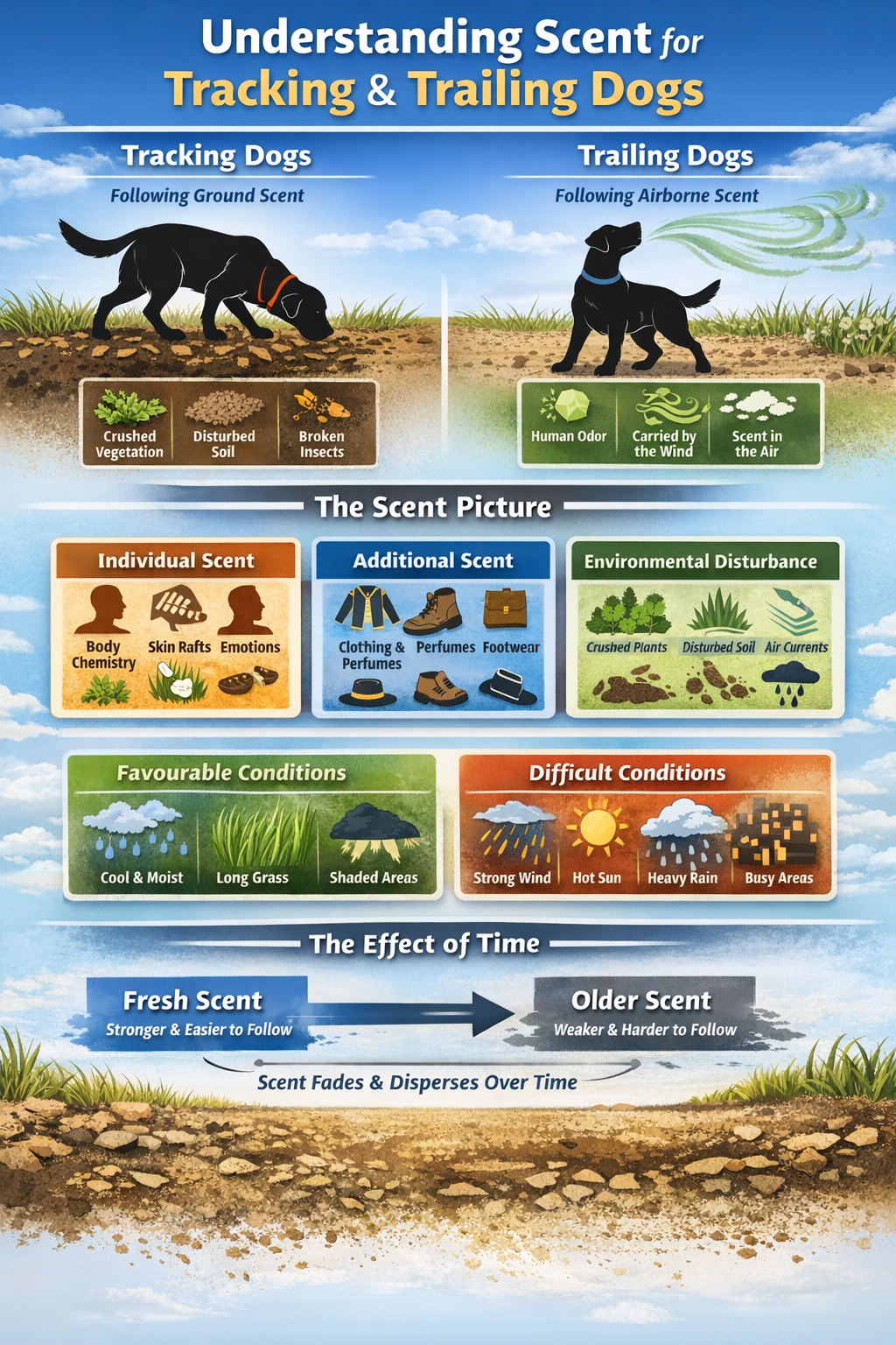 This article explains what scent is, how dogs detect it, and how environmental conditions affect both ground tracking and human trailing work.